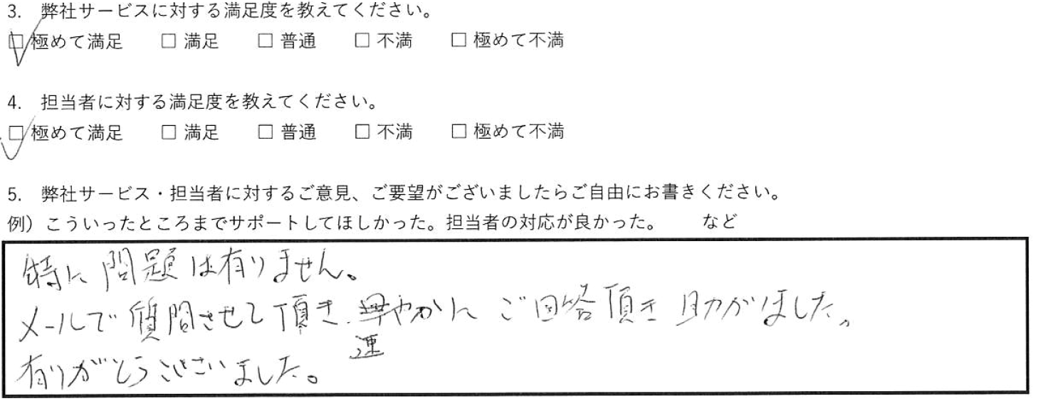メールで質問させていただき、速やかにご回答いただき助かりました。有難うございました。